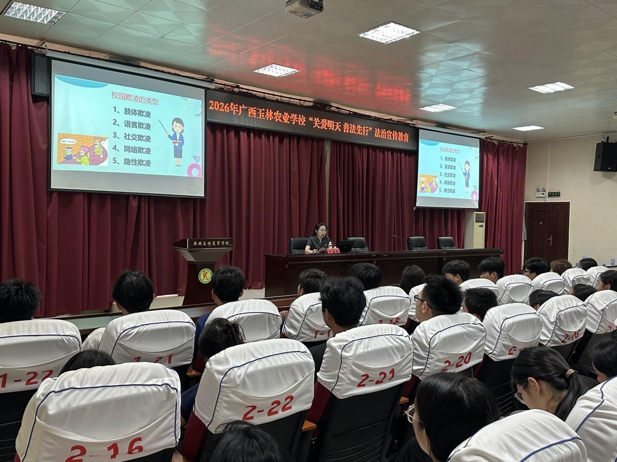通讯员:吕思宏为深入推进青少年法治教育,筑牢校园安全防线,3月27日下午我校特邀玉林市中级人民法院法官助理卢雨虹走进校园,开展“关爱明天 普法先行”法治宣传教育专题讲座。本次讲座重点解读自2026年1月1日起施行的新修订《中华人民共和国治安管理处罚法》,我校280余名学生代表到场参加讲座